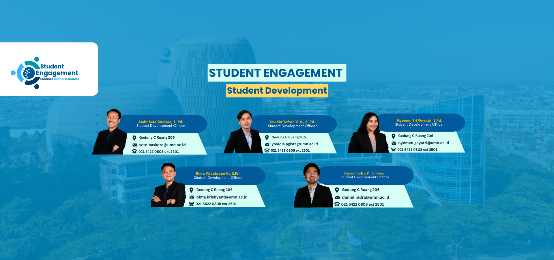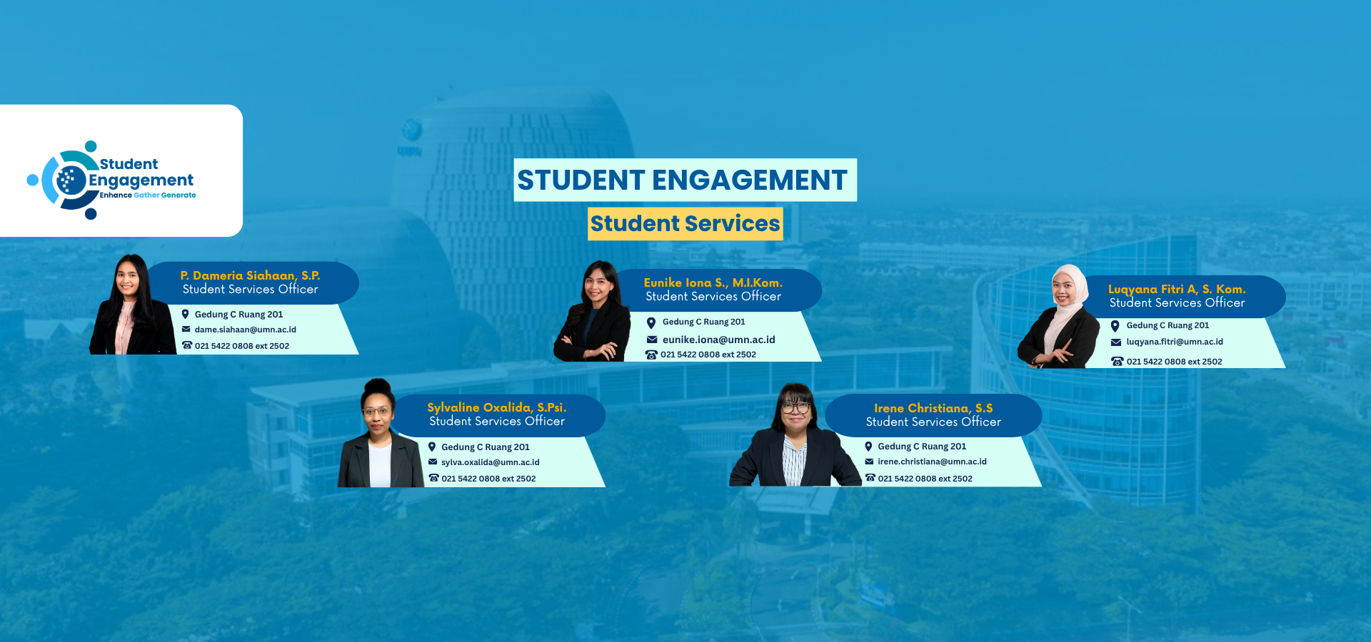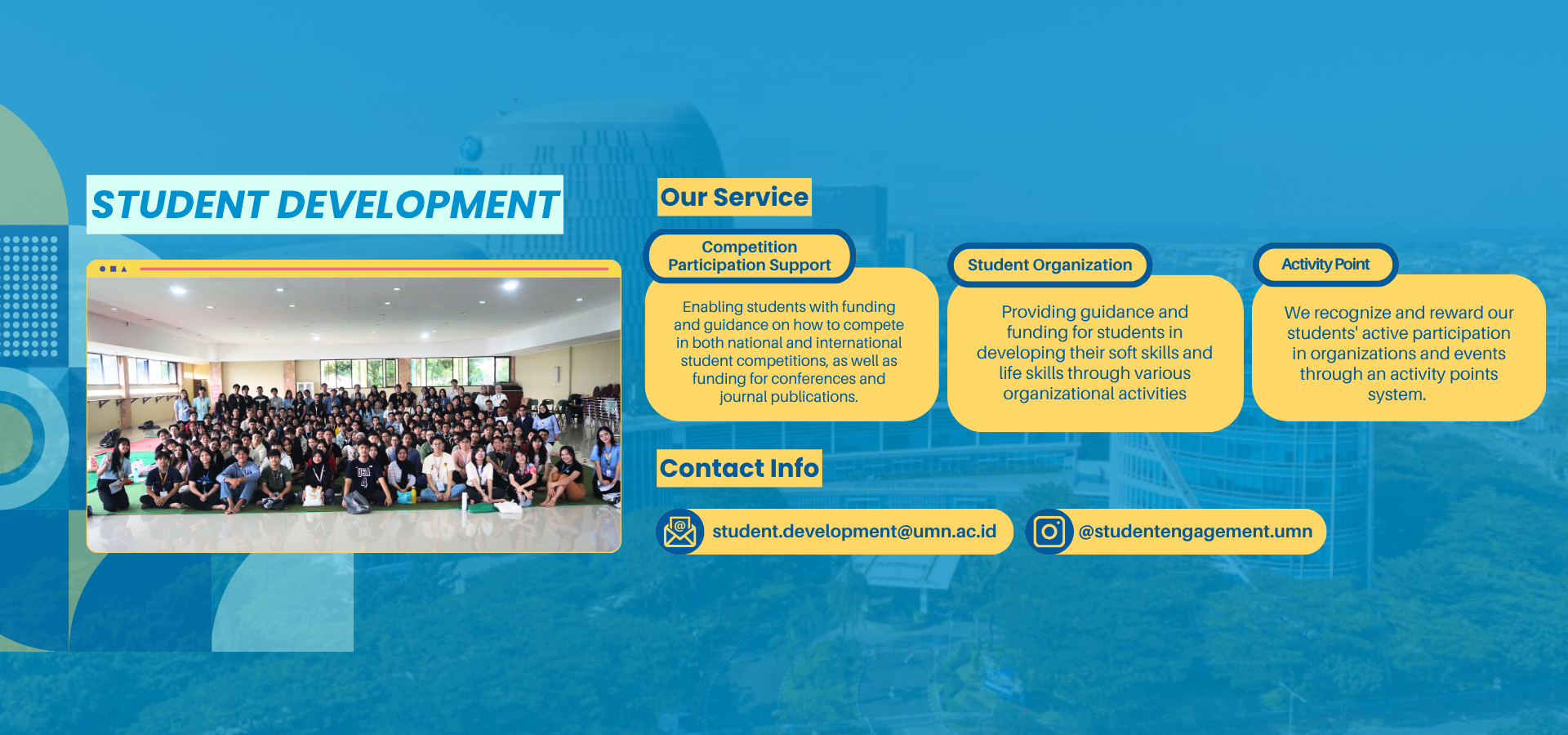 Divisi Kemahasiswaan UMN terbagi dalam 2 divisi besar, yaitu Internal Student Affairs dan External Student Affairs. Internal Student Affairs terdiri dari Student Development, Student Support, dan Student Services. Sedangkan External Student Affairs terdiri dari Career Development Centre, Scholarship, dan Alumni Relations.