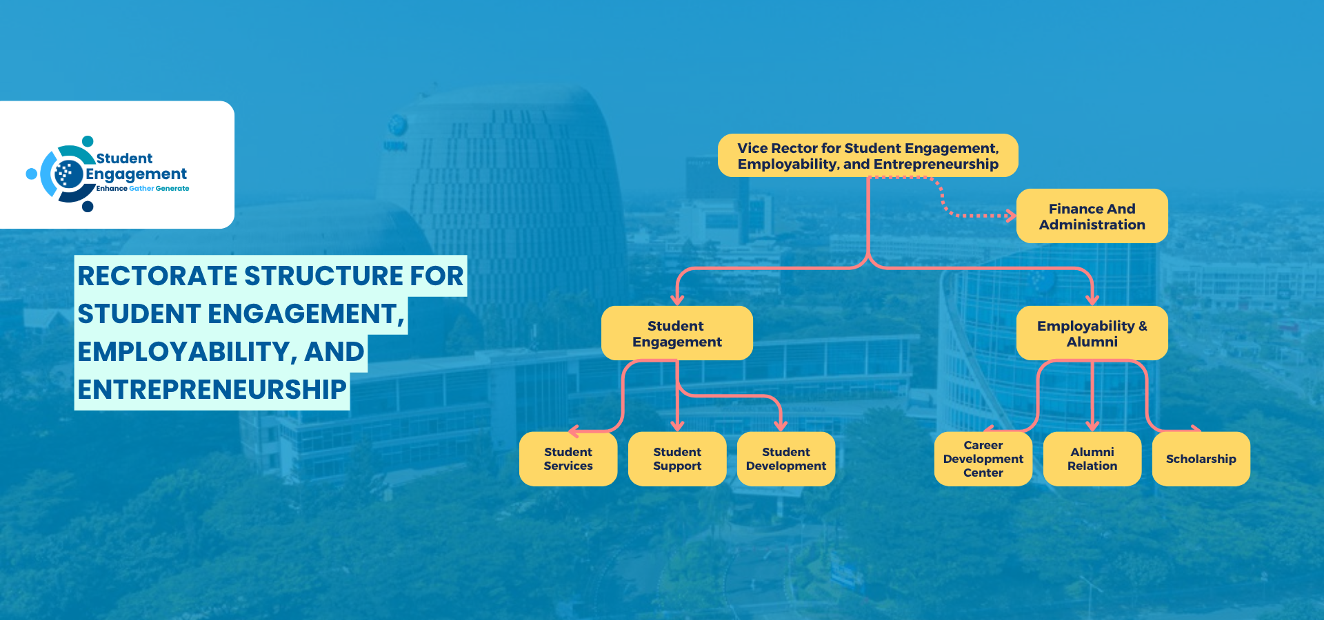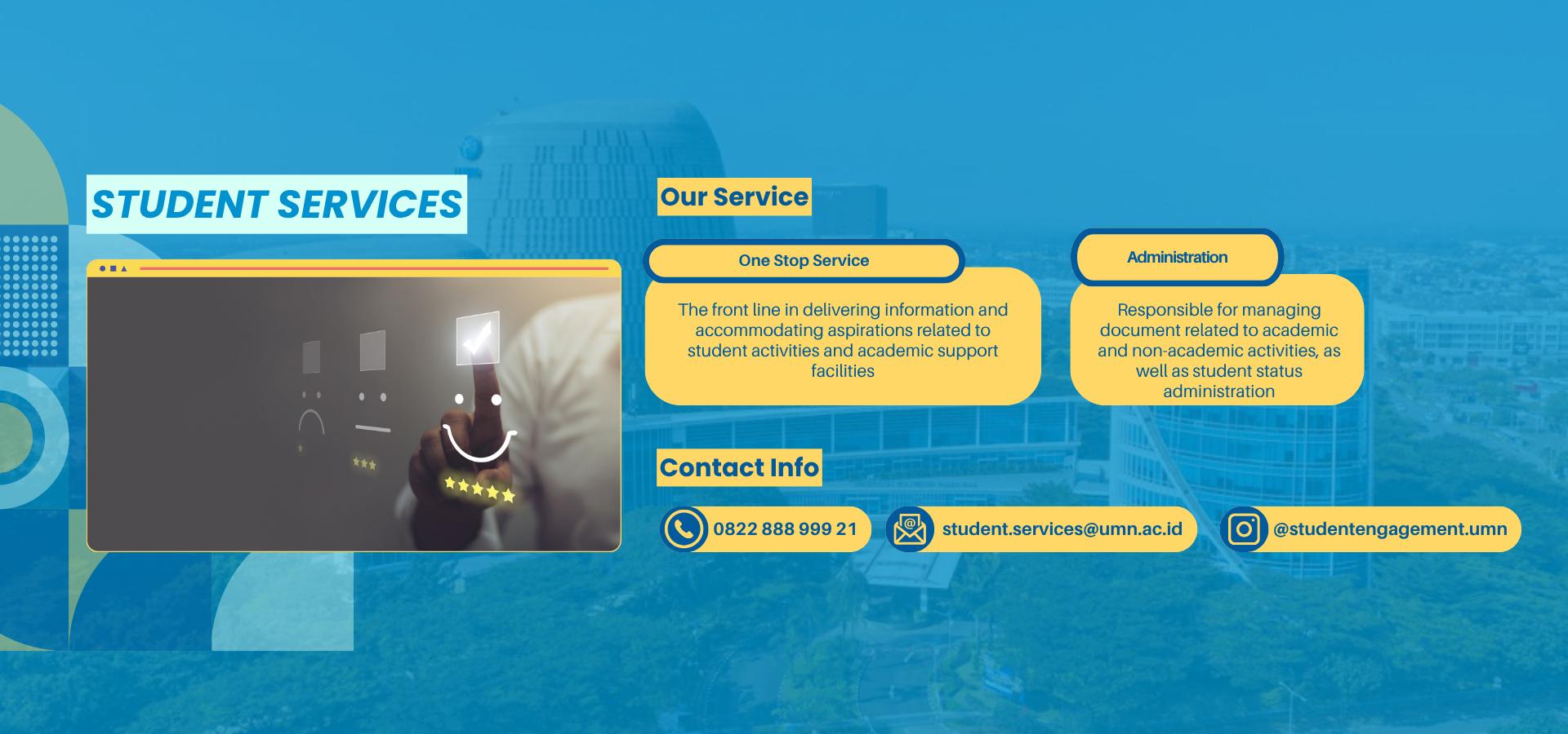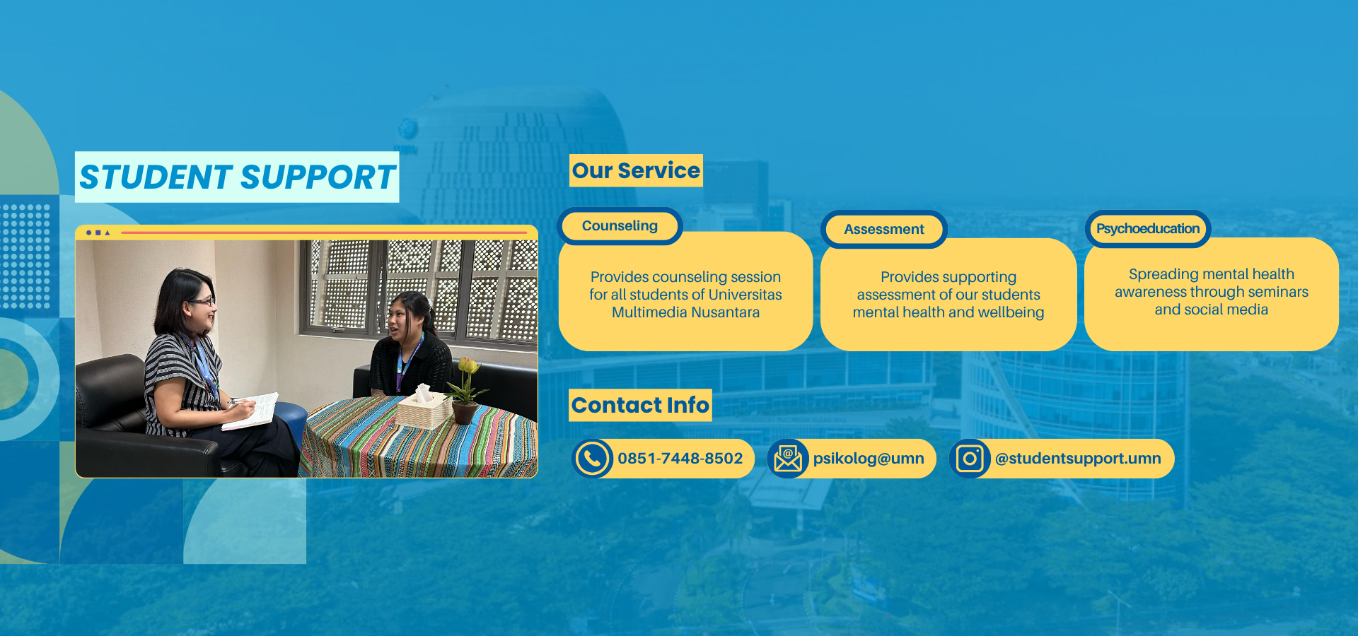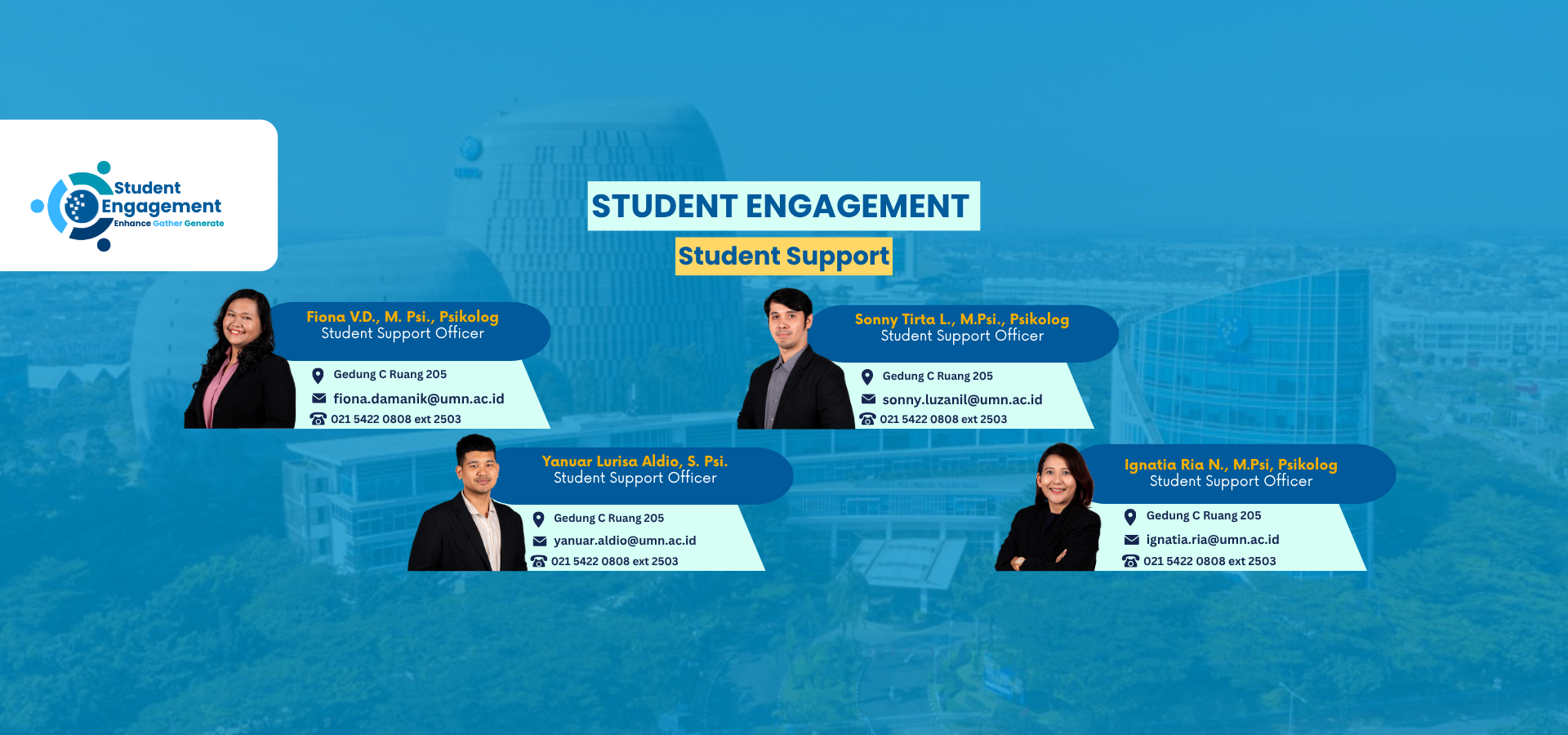 Divisi Kemahasiswaan UMN terbagi dalam 2 divisi besar, yaitu Internal Student Affairs dan External Student Affairs. Internal Student Affairs terdiri dari Student Development, Student Support, dan Student Services. Sedangkan External Student Affairs terdiri dari Career Development Centre, Scholarship, dan Alumni Relations.